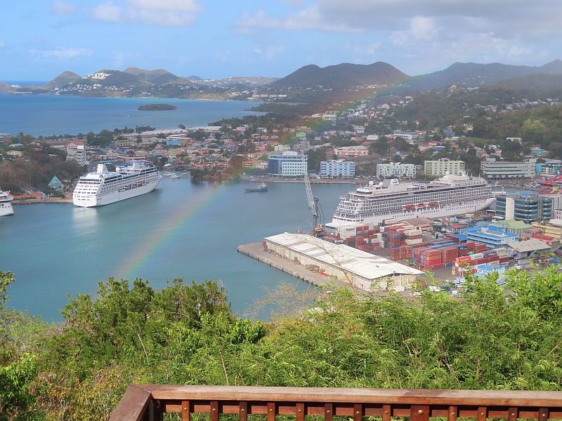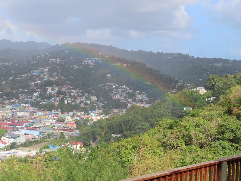 That afternoon we simply went on a minibus tour of the island, which included a visit to a local nunnery where there was a demonstration by some local dancers, together with a serving of yet more rum punch in their beautiful garden. At one point on this tour we stood on a hilltop in lovely sunshine, looking down over the harbour where a shower of rain was creating a beautiful rainbow.
