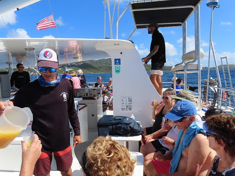 The sea was calm and cool, but not unpleasantly so, as we lowered ourselves into the water. Debbie soon found that she had difficulties with the mouthpiece and mask, whereas for myself I found it difficult to co-ordinate my swimming and breathing actions, so I kept getting mouthfuls of sea-water. However I persevered and was rewarded with successfully swimming out to see a sunken shipwreck. After everybody had returned to the catamaran we continued to another bay; Debbie decided to stay on board this time, but I was pleased to find that my system had learned the lessons from my first swim and I was no longer trying to swallow the sea!. Happily I swam away, watching the sea-bed with great clarity through my custom lenses, until I was rewarded with a clear view of a sea-turtle swimming below me. I was exhausted by the time I returned to the catamaran, but the plentiful supply of rum punch that was served on our return journey managed to revive me.
