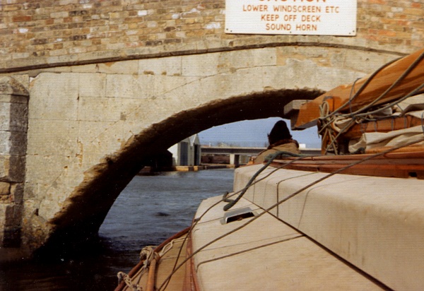 To get through the few bridges, it was necessary to lower the mast. This could be achieved in just a few seconds without lowering the sails on the mast, so you could sail right up to a bridge at full speed, drop the mast at the last minute, drift under the bridge from your own momentum, and raise the mast beyond the bridge to resume sailing before the boat came to a halt. Very impressive when it went well, but a potential disaster if anything went wrong. Here is a sequence to show the shooting of Potter Heigham Bridge, the lowest on the Broads (actually taken on separate occasions, the first photo was taken on a day when we cheated by using the engine, but the remaining three represent genuine 'shooting')