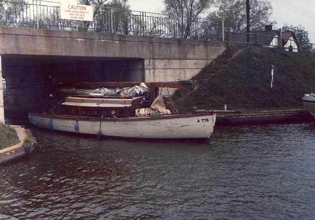 A few years (and a few non-photographic visits) later, in 1971 I hired the 4-berth centre-cockpit sailing boat 'Calypso' for a week from A.D.Truman of Lowestoft. The steering on this boat was weird, she had a vertical tiller sticking up through a slot in the cockpit floor, and you pushed it from side to side to turn the rudder by means of a series of wooden hinged levers that ran under the floor of the rear cabin. When the linkage fell apart and put us aground on the tidal section north of Yarmouth we had to more-or-less dismantle the entire rear cabin to get the floor up and fix the linkages back together again.