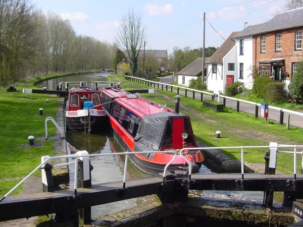 By the time we reached Braunston we were getting quite good at the art of casting off the cross straps as we approached a lock then swinging Keeping Up to one side and slowing down, so that Forward came alongside us as the two boats came to a halt together inside the lock. When it worked it was most impressive; when it didn't the results were utterly chaotic! The rain and the gales got steadily worse, but we remembered Billy Connolly's comment that "there's no such thing as bad weather, just the wrong clothes" and just kept on going. We had to keep going quite fast at times (apologies to some of the moored boats that we passed!) because otherwise the wind would blow Forward sideways and bring us to a halt; and yet a hire boat insisted on overtaking us as we approached Milton Keynes aqueduct and we had to do an emergency stop to avoid jamming across the start of the aqueduct; that left us stranded with two boats jack-knifed across the cut while the departing hirer swore obscenities at us for not making it easy for him to overtake. The next day we met another hire boat coming towards us at Pitstone; he didn't mind waiting for one boat to come through the bridge but didn't want to wait for another so he came straight through as soon as Keeping Up emerged, hitting Forward head on as a result!