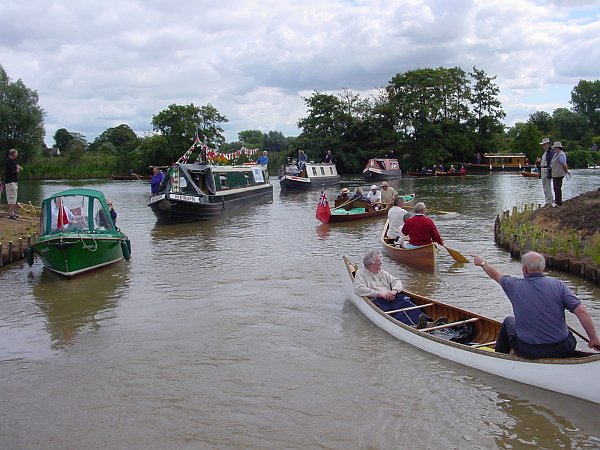 Reaching the junction that morning we moored somewhat creatively by throwing a line to a passing photographer on the bank, who passed it around a convenient tree and threw the end back to us. Others were even more creative in their mooring techniques, including the line of boats who tied to the "Danger" sign at the head of the weir stream.