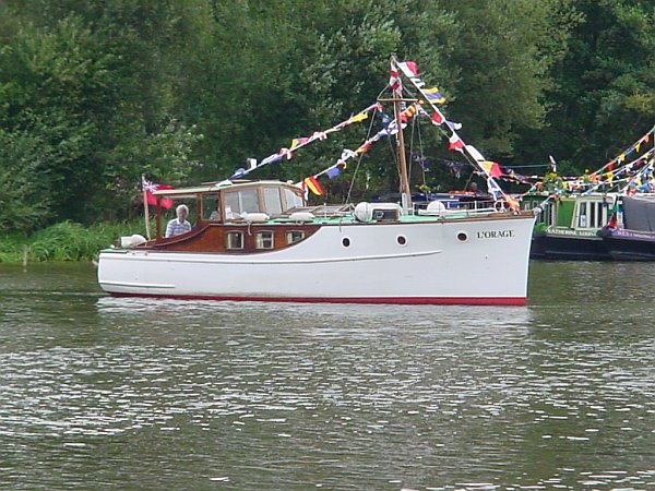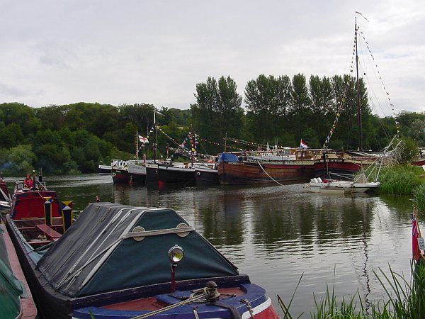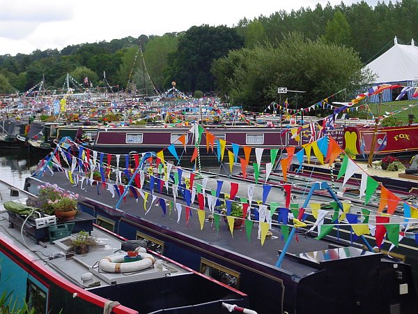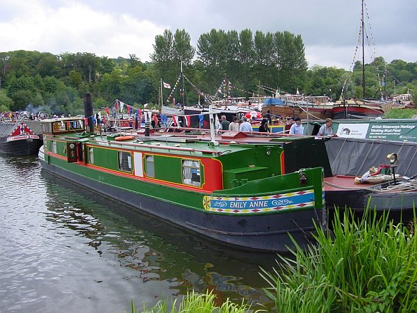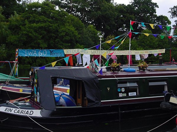 All the organisation had been impeccable; we'd received clear instructions from the IWA and also our licence from the EA, and we had been allocated a bank-side mooring which would make it so much easier getting on and off with the dogs. This meant that we may have up to 6 boats moored outside us, and we did wonder how we would manage if we arrived to find them all tied up on the mooring so that we had to cast them all adrift in order to moor up. In practice it worked fine, there was only one boat already there when we arrived on the Thursday afternoon and a helpful IWA mooring warden was there to help us as soon as we arrived. The one snag was that we were totally hidden by the bulrushes, and I know that several people who were looking for us, walked straight past without spotting us. Several people with the same problem, simply cut down all the reeds and bulrushes, but we didn't feel like doing that so we stayed hidden. A number of people from the Canal World Forum did find us however, and we passed some enjoyable hours chatting over a few beers together.