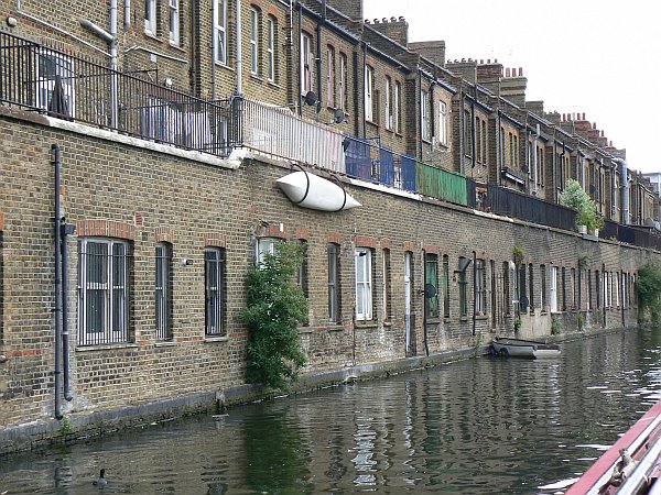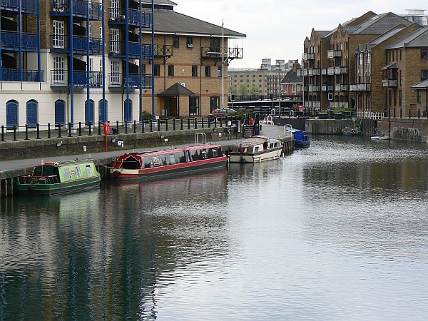 With a crew of five people on two boats we made rapid progress down the Grand Union. Passing Apsley, where I used to work, I was amazed at how different it looks now; in place of the old mills and paper works there are modern buildings and a marina, and I wouldn't have been certain that it was the same place had it not been for the little two-arched bridge that I knew so well outside my office. The smaller arch was built for the river Gade to flow through without impeding the progress of a boat in the main arch. It was not long before we reached London; it was a hot day, and the area around Camden Lock was buzzing with life so it was tempting to stop, but we were on a tight timescale to reach Limehouse Basin in just four days so we pressed on until we reached the basin for the night before our tideway trip. I was pleased that Molly and Telford had no difficulty jumping between the boat and the high wall of the basin, and I found a really nice park to walk them in just a hundred yards away.