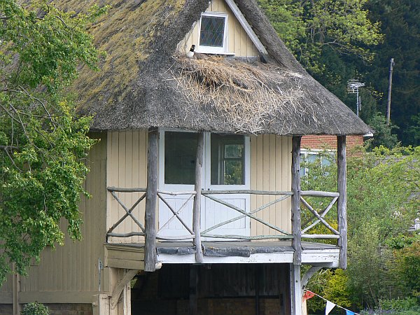 We were able to stop for the night and purchase essential supplies at Tesco's in Reading. All but one of the illegal occupiers of the moorings have been successfully moved on now, so we had no trouble in finding somewhere to moor - not on the jetty admittedly, but between two trees next to a good section of bank. We also spotted another unauthorised resident at Reading; a Canada goose had decided that it would be less effort to adapt someone's thatched roof than to make a nest from scratch. The goose looked very comfortable on the roof, but I wonder what the owners thought about it?