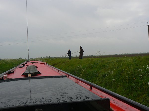 The next morning our friends set off along the Drain first, only to stop after a couple of lengths and spend several minutes flinging great handfuls of weed up from the weed-hatch. A few lengths later the process was repeated, and then again, so we decided instead to jump ashore with the ropes and bow-haul the boat for the first few hundred yards. Encouraged in our efforts by the dogs who found it all highly amusing, we soon reached clearer water and caught up with our friends without having to make a single visit to the weed-hatch. By now we were all in high spirits, and working really well as a team, so we were all ready for our assault on Bunkers Hill. Turning right into the West Fen Drain we suddenly realised that the water levels must be now further above normal as we passed under a nominally 6ft bridge with only about 3” to spare. Looking round, we watched in trepidation as our friends approached the bridge unaware of how low it was, but thankfully they cleared it by at least an inch!