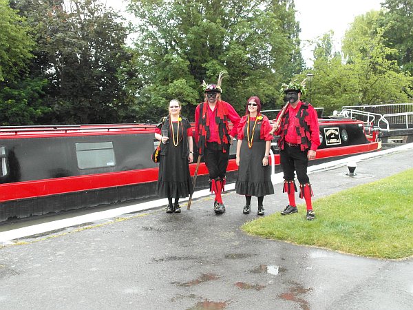 Morris dancers pose next to the boat at Stoke Bruerne |