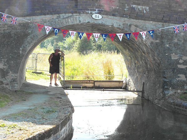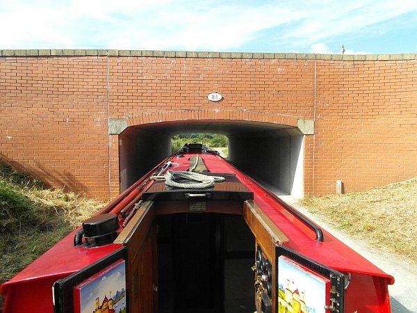 Our trip down the beautiful, peaceful Montgomery canal was delightful in the hot sunshine. We passed a small horse-drawn trip-boat and carried on to the old limit of navigation at Gronwen where we winded and continued down the newly-opened section beyond the bridge (there is no winding-point on the new section, so one direction must be travelled in reverse). The new section was wonderful, with stunning views across to the Welsh mountains, and was deep enough to make reversing fairly easy so the 3/4 mile trip took us about an hour. The few people whom we met - or whose houses we passed - rushed to take pictures of us as we passed. It turned out that only a handful of boats had travelled the section before us, and that the official opening ceremony was going to take place the next day so disappointingly the bunting was not actually there to celebrate our arrival.