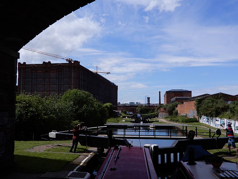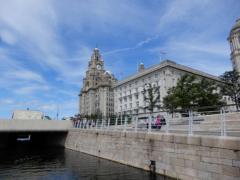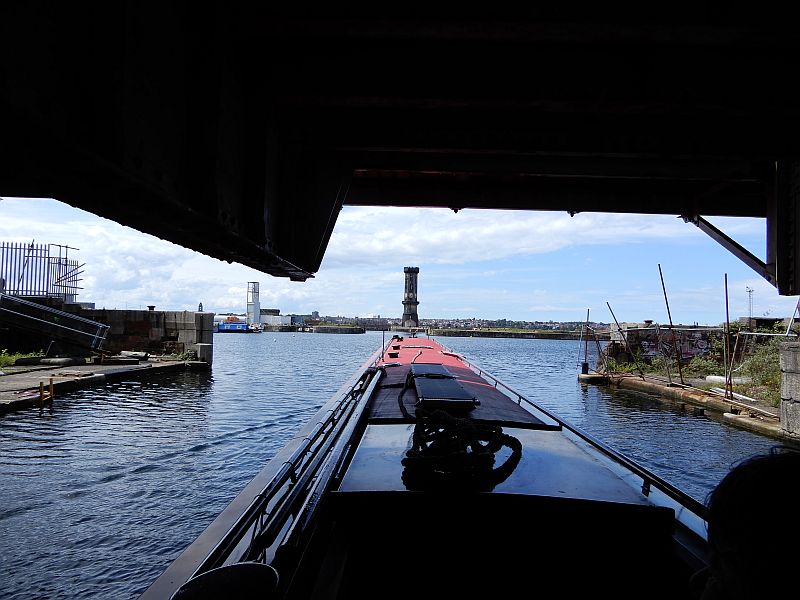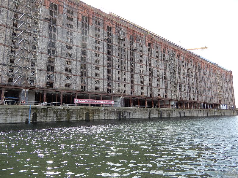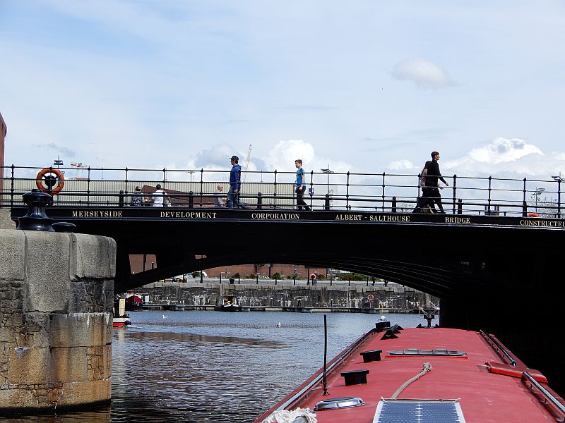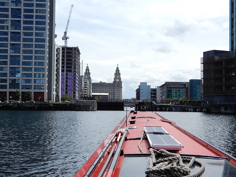 The descent through the 4 locks into Liverpool docks was quickly accomplished with the help of a few volunteers, and we were lucky enough to be guided through the docks by a CRT employee called Sid who told us a great deal about the area. For example, he pointed out to us how the conversion of an old tobacco warehouse into flats required the removal of alternate floors because it had been built with ceiling heights of only 4 or 5 feet so as to maximise the floor area for storage, and had employed children there who did not need any extra height to work in. He guided us across to a new channel which had been dug to interconnect two of the docks; at the opening ceremony he had commented 'but it's only a ditch' and the name Sid's Ditch had stuck - there is even a name-plate announcing it as such.