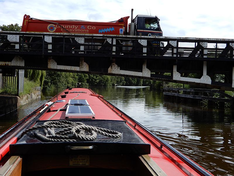 As with the rest of the canal, there are numerous swing bridges of all types; manual bridges, electric bridges, hydraulic bridges, and broken bridges. Yes, broken bridges; somebody had destroyed the control cabin of one of the swing bridges and pushed it into the canal using a mechanical digger, and the expensive mechanism would take months to repair. The official statements from CRT referred variously to 'random vandalism' and to a 'marauding band of gipsies' but the people we spoke to at the site told a different story, of a deliberate act of revenge by a disgruntled local whose actions had even been captured on CCTV. They told us that the local Police would not prosecute despite the evidence because nobody had been injured, and they had merely issued a crime number and suggested that CRT claim for the cost of repairs on their insurance. Meanwhile, CRT were sending a team of workers to swing the bridge open manually for just one hour twice a week, to allow boats to pass through it. It was a good thing that we had a flexible and unhurried schedule because the opening times did not fit well with the available opening times of the locks down into Liverpool, but we arrived there a day ahead of the opening time and joined the queue of boats that were waiting to pass through the bridge, then joined them to travel onwards as a convoy and share the work of opening the remaining bridges