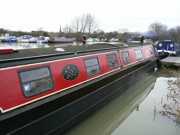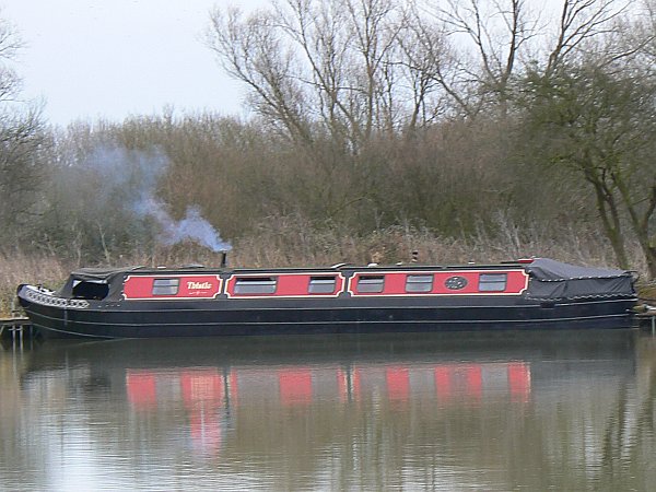 We bought Thistle in 1987. She was very homely inside although she looked a little tatty. It seemed as if every repairer in the Midlands had helped to fix something on her; as a result the plumbing was "interesting" with every pipe changing diameter several times on each run, the electrics shared so many circuits that every time you turned something on something else would turn off, she still leaked like a sieve whenever it rained (although at least the hull didn't leak, courtesy of lengths of angle welded along the chines), and so on. It seemed as if a previous owner preferred painting to cleaning, for I counted 11 coats of paint on the cabin with a layer of dirt between each one; when we bought her, the roof and gunwales were red and the cabin sides were black, a colour scheme that looked so good we kept it and even painted our next boat 'Keeping Up' the same colour.