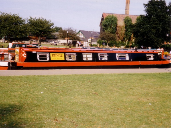 After 5 years at Trevor she was getting rather too old for a hire boat. Anglo Welsh wanted to sell her but to retain the name for her replacement; to avoid the time, effort, and cost of changing the name of a registered ship, she was instead declared "sunk without trace near Llangollen". Lloyds were happy to accept this as long as there was no loss of life and no insurance claim was being made. We were told that after a statutory 28 days the Lutine Bell was rung and she was officially declared to be lost. So she was sold, and renamed 'Thistle'. She was much loved despite her endearing quality of leaking copious amounts of water whenever it rained; she leaked all the way along the gunwales where the GRP met the steel, she leaked all around every one of her outward-opening windows, and she leaked at every point where the handrail was screwed to the roof.