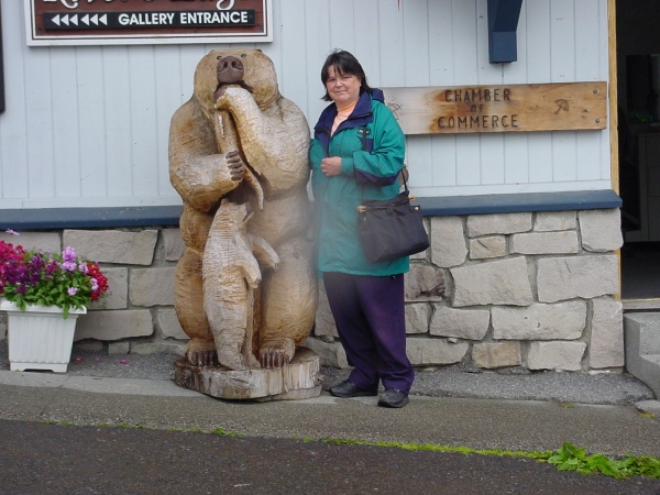 Today is our first port of call at Wrangell, located on the north end of Wrangell Island. We had booked the “Wrangell City Tour”. What a surprise we got when the “tour bus” arrived – it was an American School Bus with very narrow seats! We were to get used to having School Buses take us about on our visits. We found that taking the “tour” was usually the best way to see the various sights in our ports of call. The coach offered "All weather tours", highly appropriate for Alaska. Today we saw the Petroglyphs (primitive designs carved into rocks on the beach), the Museum with collections from the indigenous Tlingit Indian tribe, from the Russians, from the Americans and from the other cultures that have influenced Wrangell’s colourful past, then we visited Shakes Island with Chief Shakes Community House. Chief Shakes was one of the Tlingit leaders from the early 1800s; see how the entrance is built low so that entrants have to stoop; if they are friendly this will mean they pay homage to the Chief, but if they are enemies they are ideally placed for having their heads chopped off! The Tlingits were semi-nomadic; they could take the house to pieces in about half an hour, and would take it with them leaving just the 4 corner posts in the ground for their return.