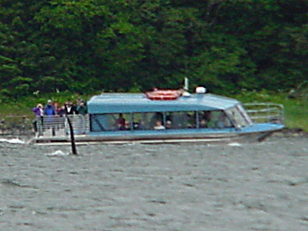 Today we have booked a helicopter trip to the Mendenhall Glacier with a dog-sled ride when we get there. The weather seems a little overcast! Oh dear, they tell us that the helicopter isn’t flying today as the cloud base is too low. As you have to book your trips ashore in advance we did think we would be spending our time in Juneau looking at the shops, and seeing how much more detail we could find in the mural. However the powers that be (on the ship) managed to arrange an extra boat to take those who wanted to go “Whale Watching” instead. Oh yes! We had been disappointed that we had had to choose between the “Whale Watch” trip and the helicopter and dog-sled trip, so we were not too upset.