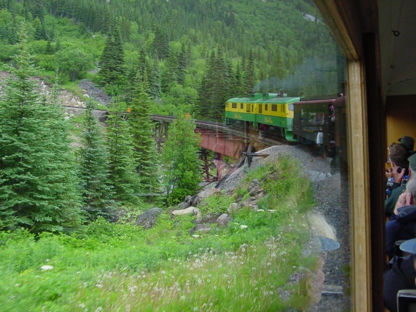 Today we arrive at Skagway with an 8.30 a.m. start on our rail trip to follow in the footsteps of the early gold rush explorers. The first explorers found the route on foot, having to haul all their possessions on dog sleds. The scenery on the “White Pass Railway” is magnificent. We went right up into the mountains, clinging to the side and crossing precarious bridges, climbing ever higher until we reached the border with Canada! Yes we had to take our passports with us (just in case!). Across the flat plain on top we saw Caribou, although as the cloud base was quite low we were unable to see the (supposed) magnificent views around us. When we arrived at the station we left the train and transferred to a coach for the return journey. After about 5 minutes we passed the Canadian border post but didn’t pass the American border post until about 5 miles later. Apparently both nations decided that the top of the mountain was too inhospitable for a customs post! The American post was only a cabin with a camera and a sign stating that if you had “anything to declare” you should show it to the camera.