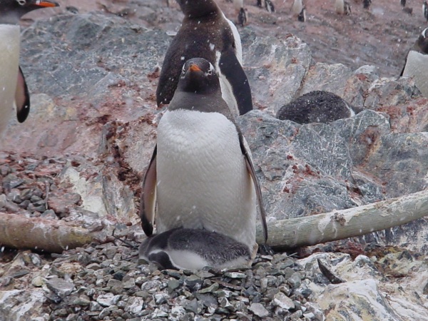Just another day at the rookery. Two mothers having a lively discussion while their babies try to hide from the snow. |