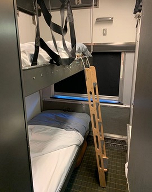 We would be spending 3 nights on board this train, so we had upgraded our ticket to an en-suite 'sleeper plus' double cabin which, although quite expensive, proved to be well worthwhile. The cabin was reasonably spacious, and very comfortable; by day it had 2 very comfortable chairs and then, while we were at our evening meal, the steward came to the cabin and converted it to its sleeping configuration of 2 good-sized bunks. In the mornings, while we were at breakfast, the steward would put away the bunks and restore the chairs. During the day, when not doing anything else (such as eating one of the excellent meals, or taking part in their group entertainments such as quizzes, bingo, films, wine or beer tasting, etc), the cabin was a very relaxing place to just sit and watch the scenery go past while perhaps listening to music or an audio-book, The scenery for the first 2 days, whilst very pretty, was very flat as we crossed the prairies, so an audio book was an excellent way of passing the time whilst also being able to look out of the window and not miss anything.