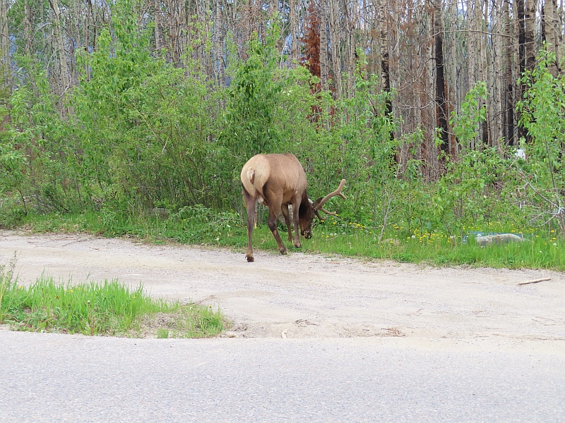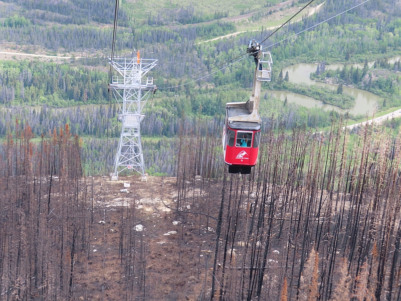 We had a day of free time in Jasper before our train to Toronto was due, and while most of our group chose to visit Lake Maligne to enjoy its scenery and wildlife, we decided to be a little more adventurous and take the Skytram cable-car to the top of Whistler's Mountain. The friendly taxi driver who took us to the lower station took us along the road where a mother bear had been spotted with her cubs just a few minutes before, but she had gone by the time we got there. Apparently female bears with cubs seek the company of humans as a way of getting away from their males (who do not like humans), but this particular one was getting too friendly and would soon need to be moved away. Indeed, at that same place, instead of the bear there was an elk grazing peacefully at the roadside.