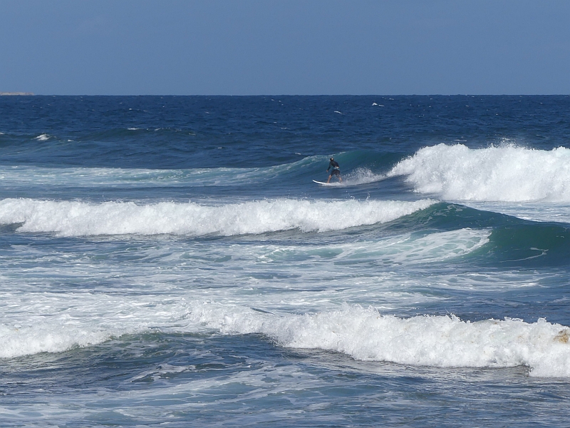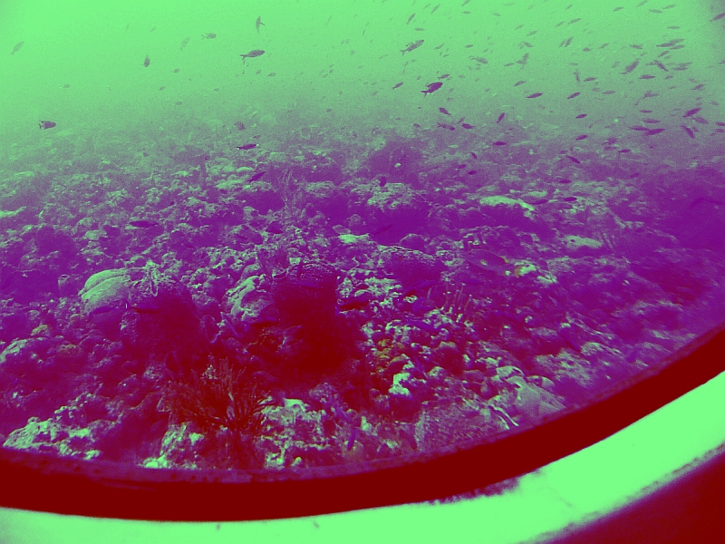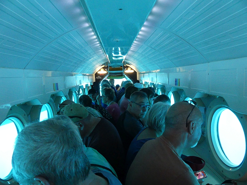 A conventional boat took us out to sea, where the submarine was waiting for us. We tied alongside it, then stepped onto its deck before climbing down the ladder to its viewing area. There were 20 seats on each side, each with a good view out of a porthole. Once we were sealed inside, the submarine descended to a depth of about 70ft so that we could observe the reef and its wide variety of marine life, before proceeding further down to a depth of 120ft where there was an old shipwreck. The commentary from our guide was excellent throughout the journey, and the view through the portholes was uniquely fascinating (although extremely difficult to photograph). As we returned to the surface we were delighted to watch a stingray swim past us, then all too soon we were climbing back onto the boat that would take us back to the shore.