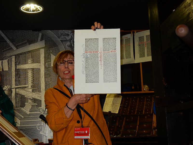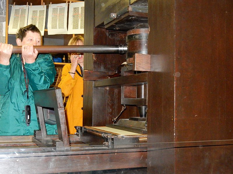The weather had finally improved, and we enjoyed sitting on the top deck in blazing sunshine as we continued up the river to Mainz. Of particular interest at Mainz was the Gutenburg museum. Gutenburg invented the printing press in the 15th century, and famously used it to produce the Gutenburg Bible of which a few copies survive to this day. We were treated to a demonstration on a replica of the original press; what a slow and tedious process it was (and even then the illuminations of the text were hand-painted afterwards). I was intrigued by the fact that multiple versions of every letter were used, in slightly different widths, to achieve justified margins; this was because it never occurred to the printers of the time that it was only necessary to adjust the sizes of the blank spaces between words to achieve the same effect.