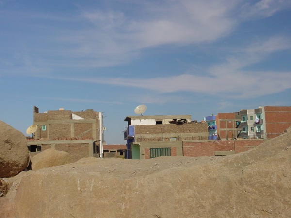 Most Egyptian houses are noticeably unfinished. As there is no need to protect against English-style weather, most houses are left unfinished and with no roof other than a sheet of canvas or some woven reeds, so that it is easy to add another storey if the children don't want to leave home. With their lack of glass windows (un-needed) and peeling paintwork, most houses look like wrecks although inside they may be quite luxurious with fine carpets and wall-hangings, air-conditioning and satellite TV. We had a small competition on board to photo the most tumble-down house with a satellite dish!