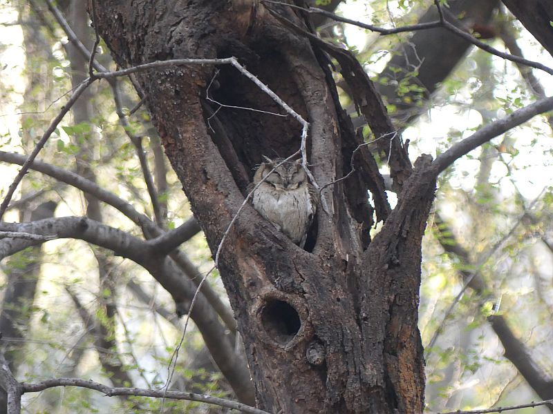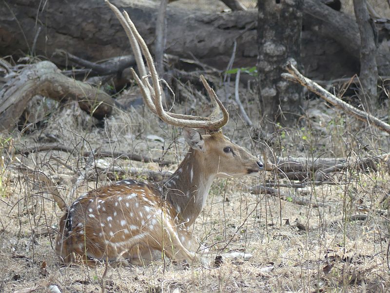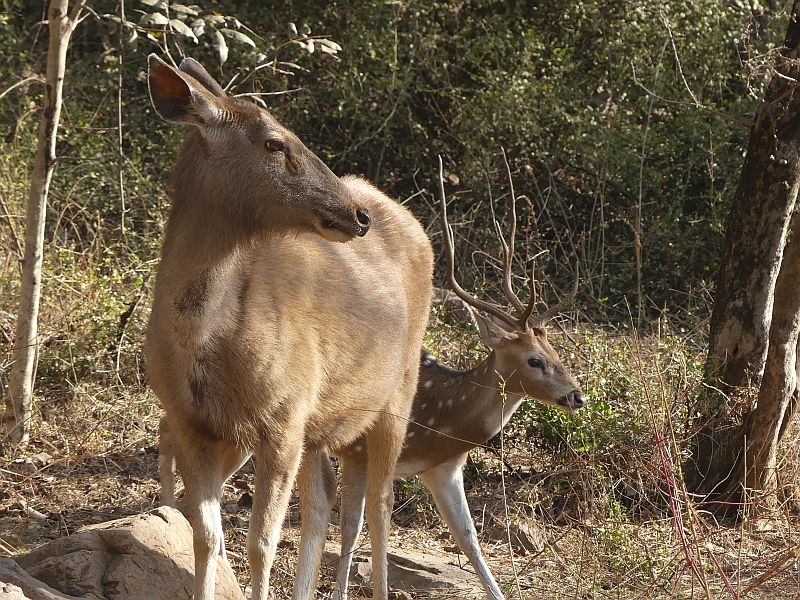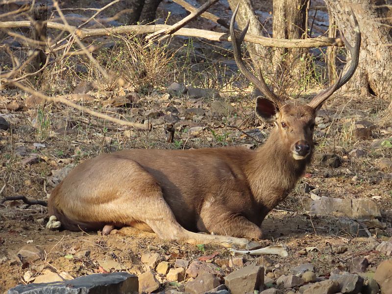 It had been a fabulous encounter, and our guide told us that it had been in his opinion up there amongst the top 5% of sightings. Happily we turned around, thinking that the day couldn't possibly get any better, but there was yet another surprise in store for us as we headed back towards the park exit. As we were pausing to observe Peacocks and an Antelope, suddenly there in the trees was an example of the other apex predator of the park, a Sloth Bear. These are a really scary animal, and suddenly we felt very glad of the protection afforded by the jeep! Our guide reckoned it was a chance in a thousand to have seen crocodiles, tiger, and a bear in this way - and what an amazing birthday it had been for Debbie!