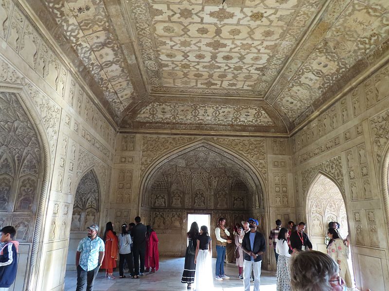 The Red Fort was built to be utterly unassailable. Under a hail of arrows, an attacker would have to swim across a moat filled with crocodiles before breaking through the entrance gate which was half-way up a 50ft wall, then make his way across a small courtyard filled with leopards and tigers before breaking through another gate which was set in a second 50ft high wall; after this gate was a narrow uphill corridor whose walls were inset with arrow-slits and also pipes through which boiling oil could be poured, leading to the final guarded gate. Impregnable, yes? Well, no actually, it was successfully stormed 5 times! On one of these occasions all the treasures were looted by the Persians, including the Peacock Throne and the Koh-I-Noor Diamond as well as the solid-gold wall decorations (which they melted away by lighting huge fires in the rooms). The Koh-I-Noor Diamond eventually found its way back to the British, and it is now part of the UK Crown Jewels collection.