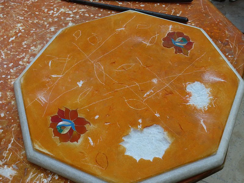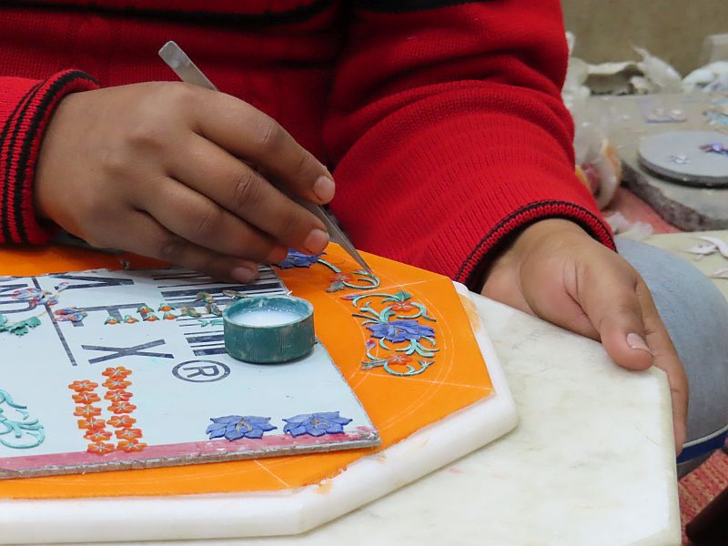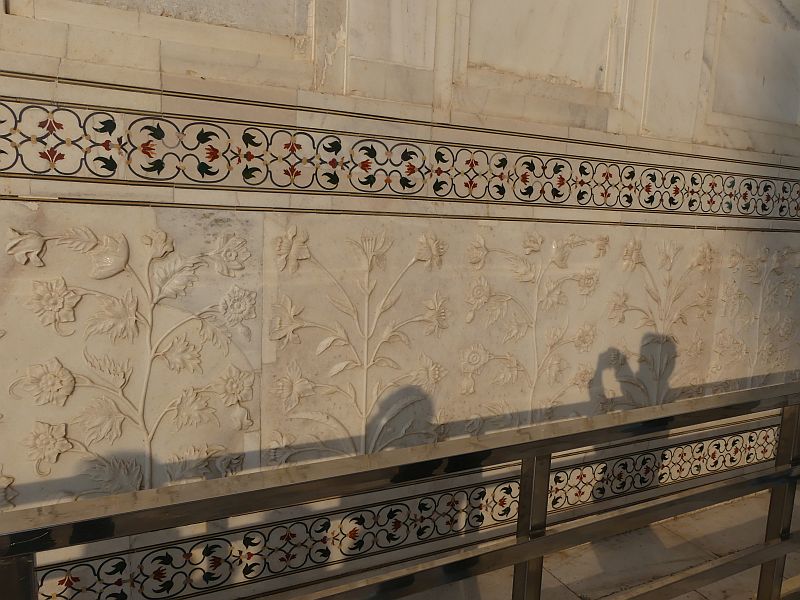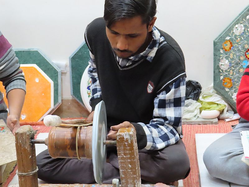 The Taj Mahal took a team of 20,000 labourers almost 22 years to build, using manual methods to create the decorations from literally millions of precious stones. In today's money it cost around £750 million - and it would be literally impossible to duplicate the processes today. We were taken next to see a rare workshop where they still practise these techniques of setting precious stones into marble to create the decorations. It was fascinating to watch the skilled craftsman at work, and to appreciate the level of effort which goes into the process. It takes weeks to produce a single small item such as a plate; it is almost impossible to imagine the effort involved in decorating an entire temple in this way! We were of course given the opportunity to purchase some samples of their work - but at a price which was way beyond our means.