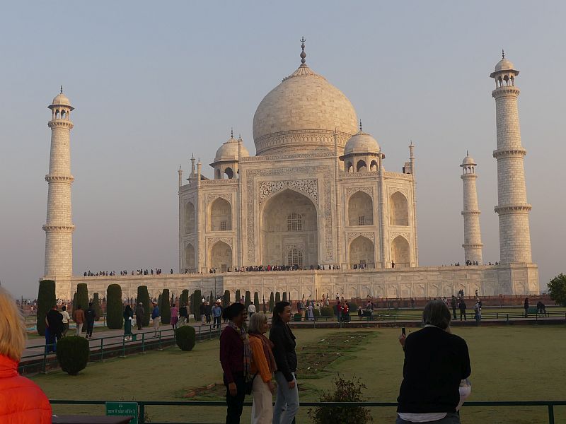 The next morning we were to have our own view of the famous Taj Mahal. We had another early start, because the best time to view this marble masterpiece is just after dawn when the sun has a little colour; later in the day the building simply appears white. The construction is an architectural marvel, and the fact that it is still standing in this area of earthquakes and unstable ground is a tribute to its remarkable construction methods. The whole building is set on a huge square platform, each corner of which bears a tower to ensure that the weight is not excessively concentrated at the centre, and as a further precaution each tower was built with a 6 degree lean away from the building, so that they would cause no damage if they were to fall.