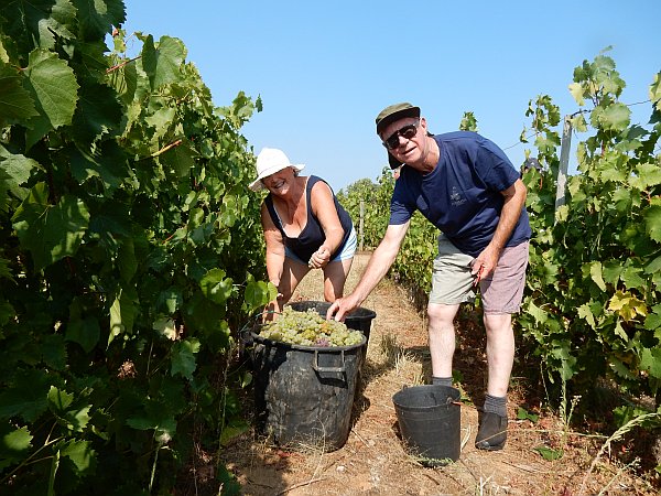 Most of the other passengers returned to the ship after lunch, but it was harvest season and we had the unique opportunity to join in the activities. In company with our jovial host, the owner of the Quinto, we walked or travelled by tractor into the fields and stopped among the rows of vines. After a brief lesson in how to recognise the best grapes we were given buckets and scissors, and we then spent an hour harvesting grapes in the hot sunshine.