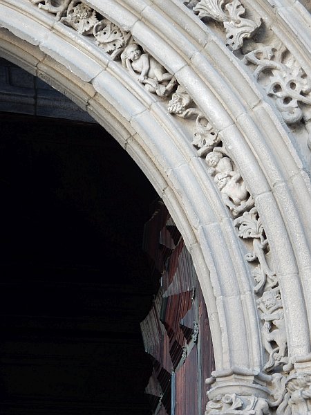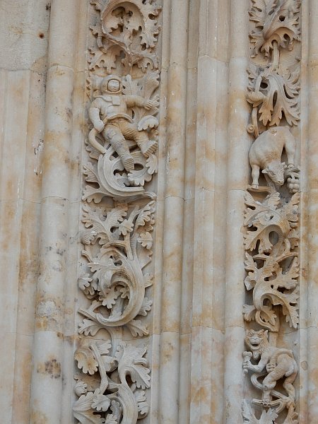 Other buildings had elaborate carvings on their facades too. For example the cathedral has elaborate carving around the doorway, which was renovated recently - with an additional detail to identify a new section: amongst the traditional emblems it now also depicts an astronaut.