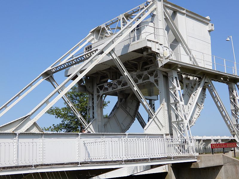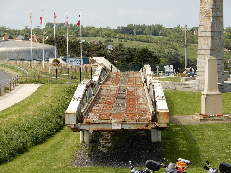 We then went to the Canadian museum at Juno Beach and saw a film which was very interesting and extremely poignant. After a short time at Juno beach we drove onwards, past Gold and Sword beaches where the British troops had landed, before continuing to the site of the Pegasus Bridge. The intact capture of this bridge had been crucial to the success of the invasion plans; to achieve the necessary element of surprise the troops had flown to them in gliders which were towed by the Lancaster bombers and launched overhead to land by the bridge and surprise the enemy. The gliders, which were made almost entirely in wood to avoid radar detection, had been secretly delivered to the RAF airfields in self-assembly flat-pack kit-form by a new company called MFI.