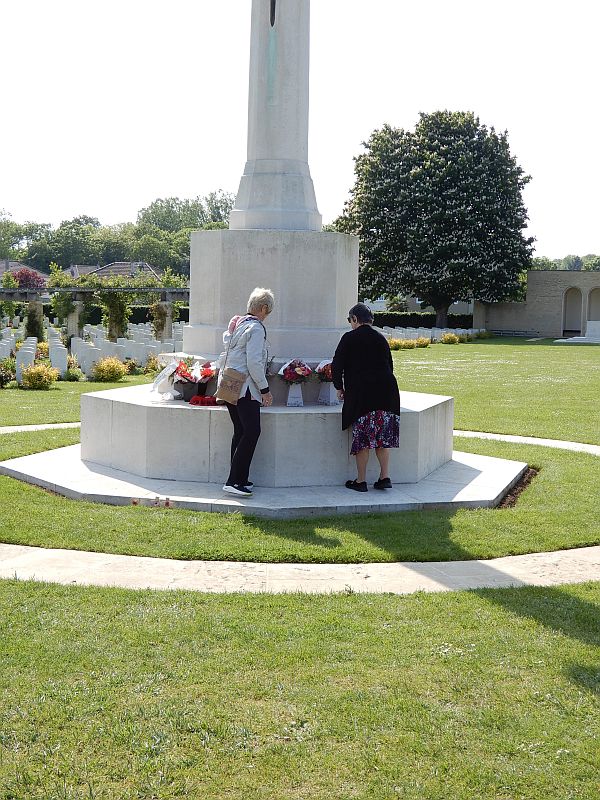 We then continued to the Commonwealth cemetery at Ranville. Rather charmingly, our tour guide gave us a couple of bouquets courtesy of Viking Cruises; then he played the National Anthem while we all stood to attention. After a minute's silence Debbie laid one of them at the memorial on behalf of Great Britain, and one of the two Canadian passengers laid the other one on behalf of the Commonwealth.