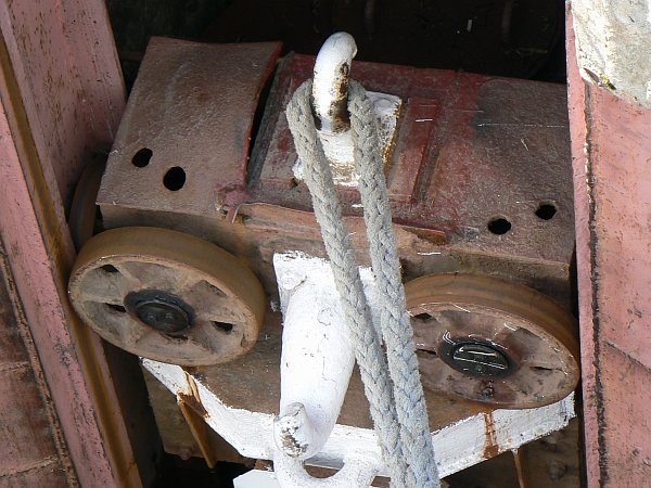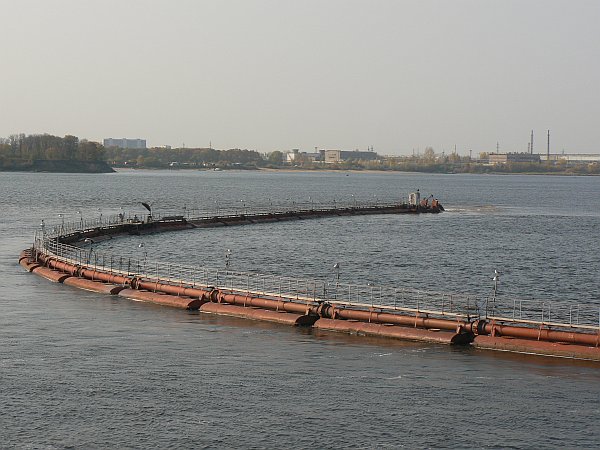 There are nine locks in the flight from the Volga up to the summit level, and boats were queuing in both directions for every lock. The total passage time for the flight was about 6 hours. The locks had one interesting design feature, namely an 'arrester' wire that is stretched across the lock chamber ahead of the lower gates, so that a downhill boat which fails to stop in time will (hopefully) be brought to a halt before it demolishes the lower gates. The wire works on the same principle as that on an aircraft carrier, in that while one end is fixed in place the other end is attached to a series of weights which will be raised by the wire to provide a steadily increasing force. I do not know what the breaking strain of this arrangement would be, but I find it hard to imagine it bringing a 5000 ton barge to a halt within the required few feet of travel unless it was moving extremely slowly already. The wire is moved out of the way by a small crane before the gates are opened.