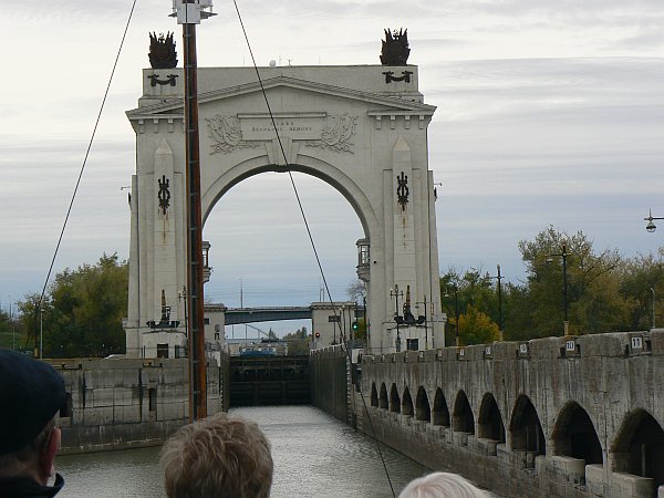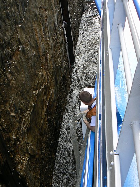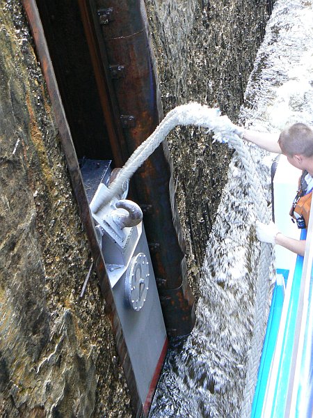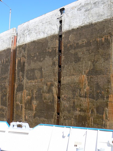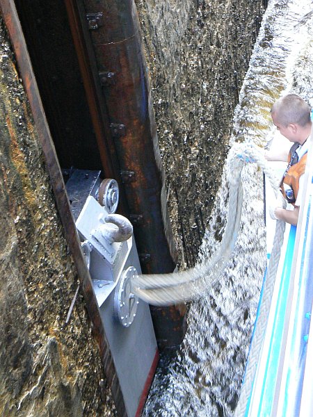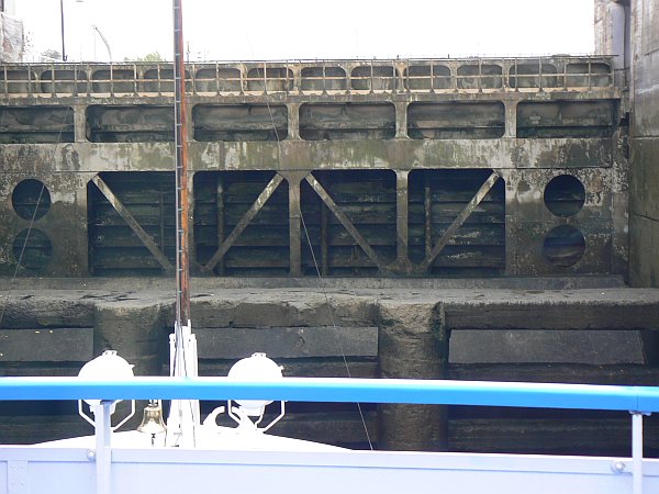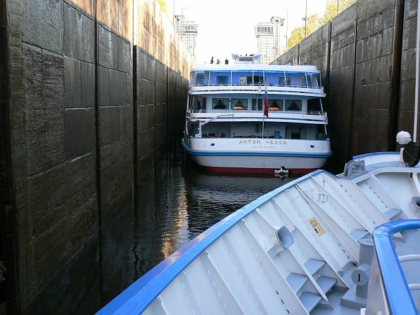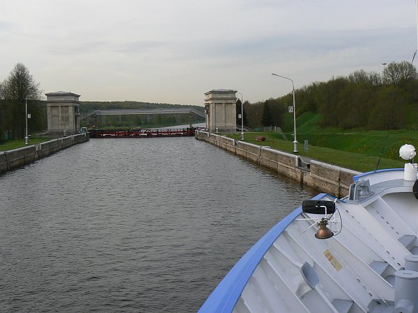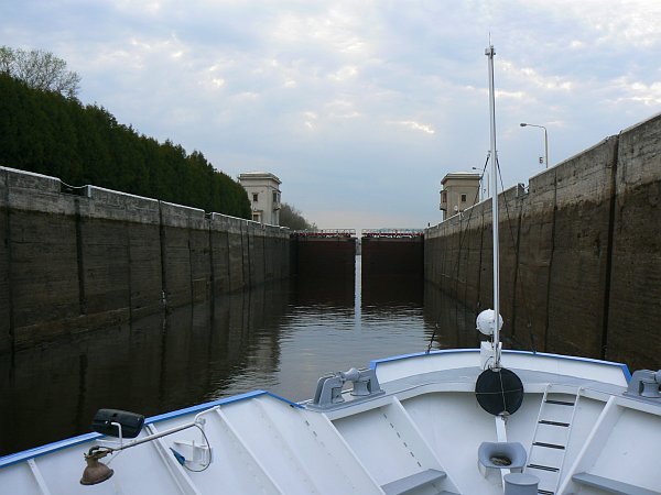 For the first 75 miles you are on the Moscow Canal which was built in 1937; it lowers you by 160 feet through 6 locks to the Volga River. The locks are wide enough for only a single ship, but easily long enough for two ships. There are floating hooks in the lockside for the ropes, but the remains of the original sets of bollards can often still be seen. The top gates are unusual in that they usually lie flat on the canal bed, and are rotated into an upright position once the ship has passed over them.