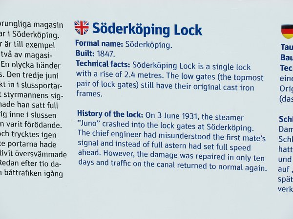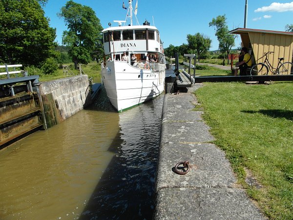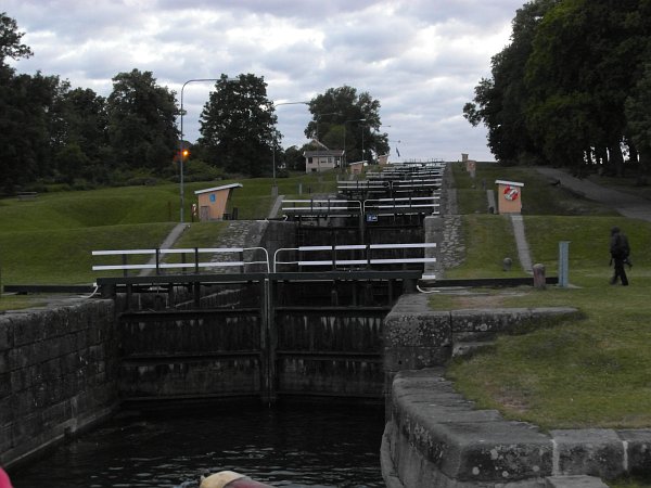 After Soderkoping there is a busy flight of locks. As we ascended, there were boats of all types following us and coming the other way. There was obviously no shortage of water as it was flowing freely over the gates, but this caused no problems as the locks were all power-operated by lock-keepers. The ship's captain told me that no exceptions are made, even for his ship: ship owners are not allowed to operate the locks or bridges themselves, and when the lock keepers go off duty all traffic must stop. Just two or three locks are still manually operated, and these are all stop-locks whose rise or fall is very small, but passage even through these is not permitted if a lock keeper is not present.