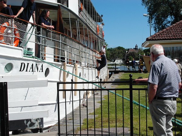 At last we had reached the start of the 120-mile Gota Canal itself, at the village of Mem. The gates of the first of its 58 locks opened as we approached, and the Diana was carefully steered in. She was a snug fit; there was about a foot of clearance on the width of the lock and about the same on the length, and one of the crew members jumped ashore to run ahead and indicate to the captain the distance from the bows of the ship to the cill of the lock. We found out that the name given to the crew member who performs this function is called the "jump-ashore Johnny" even when the crew member concerned is a young female.