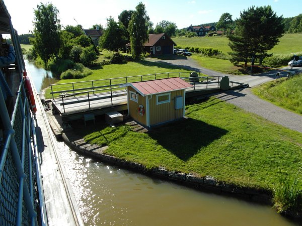 Soon after ascending the flight near Soderkoping we reached a small rolling bridge. During the journey we passed through several of these bridges, which roll back along their own road on a set of small wheels; most of them were operated remotely by the keeper at the nearest lock. These pictures and the short video illustrate their mode of operation.