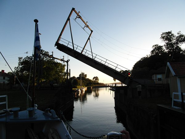 As evening fell, we crossed the beautiful lake Roxen, 100ft above sea level, and it was getting quite dark by the time we moored on the far side of the lake, at the foot of the impressive 7-rise staircase there. The approach to the mooring was marked by a giant statue, made of perforated metal (presumably to reduce its wind-resistance) which gave it a strangely ethereal quality.